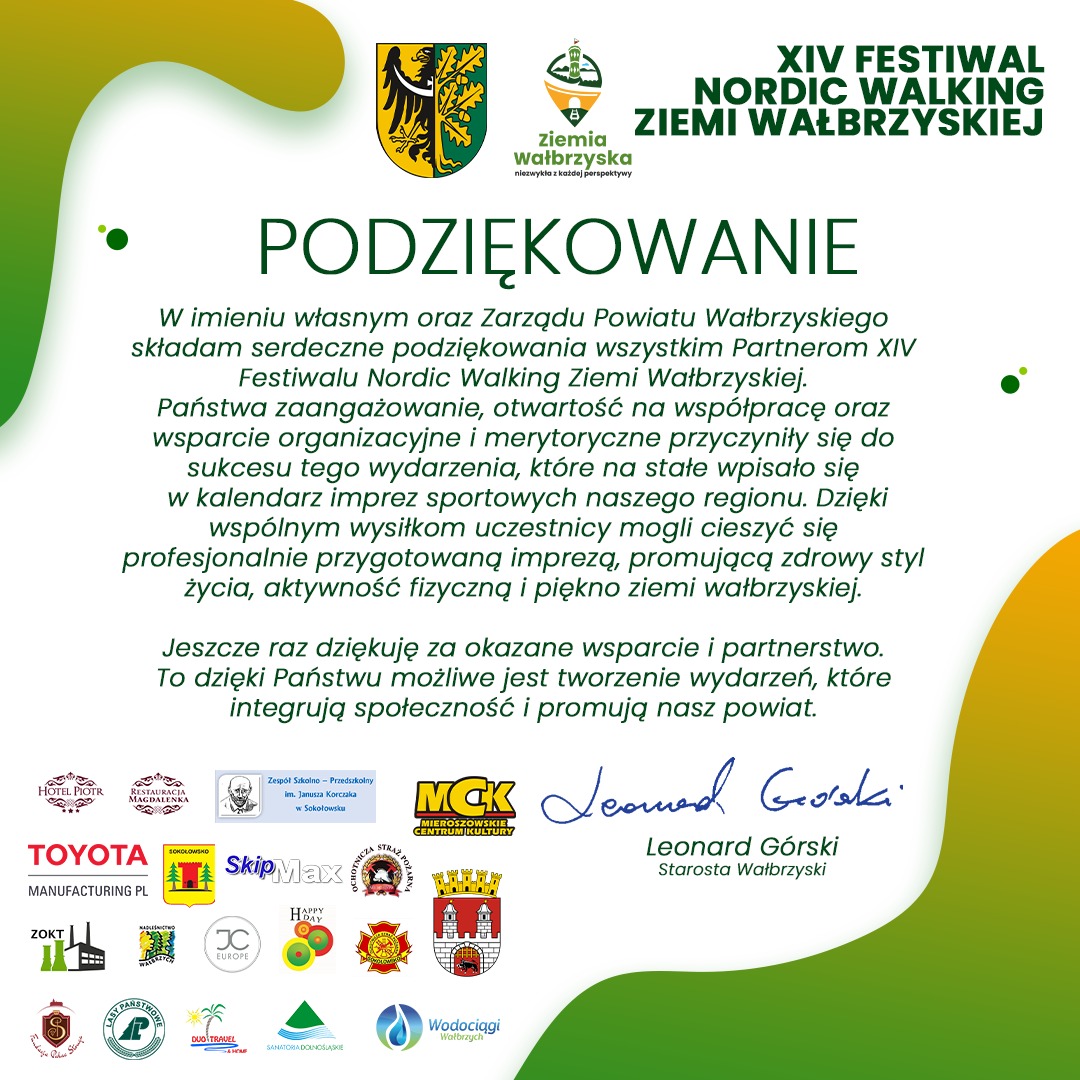Podziękowania dla Partnerów XIV Nordic Walking Ziemi Wałbrzyskiej