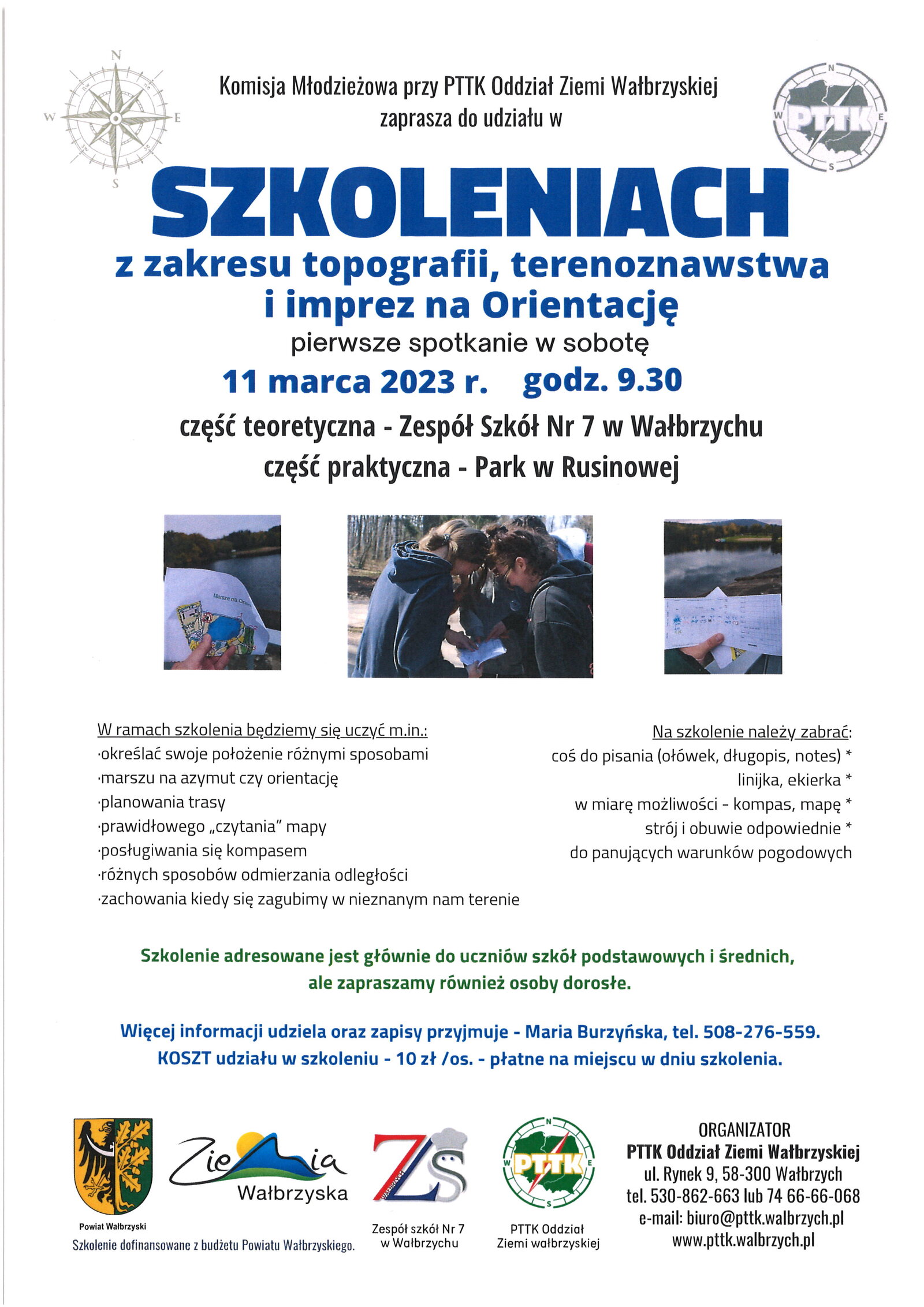 PTTK Oddział Ziemi Wałbrzyskiej zaprasza do udziału w cyklu SZKOLEŃ z zakresu topografii, terenoznawstwa i imprez na orientację. Pierwsze spotkanie zaplanowane jest na sobotę 11 marca o godz. 9.30 na terenie Zespołu Szkół Nr 7 w Wałbrzychu. Szkolenie jest doskonałą okazją do przygotowania się do konkursów turystyczno-krajoznawczych, wiedzy o regionie czy imprez na orientację organizowanych przez m.in. PTTK Oddział Ziemi Wałbrzyskiej. Szkolenia składają się z części teoretycznej oraz praktycznej w terenie. Koszt udziału w szkoleniu to tylko 10 zł/os. płatne na miejscu w dniu szkolenia.